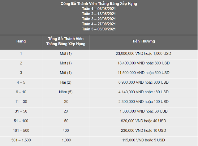Thành Viên Hợp Lệ nhận thành công ít nhất một (1) Điểm, với tổng 1,500 Thành Viên Hợp Lệ có số Điểm cao nhất sau khi mỗi Tuần Khuyến Mãi kết thúc (“Thành Viên Thắng Bảng Xếp Hạng”) sẽ được nhận tiền thưởng (“Tiền Thưởng”), như bảng bên dưới: